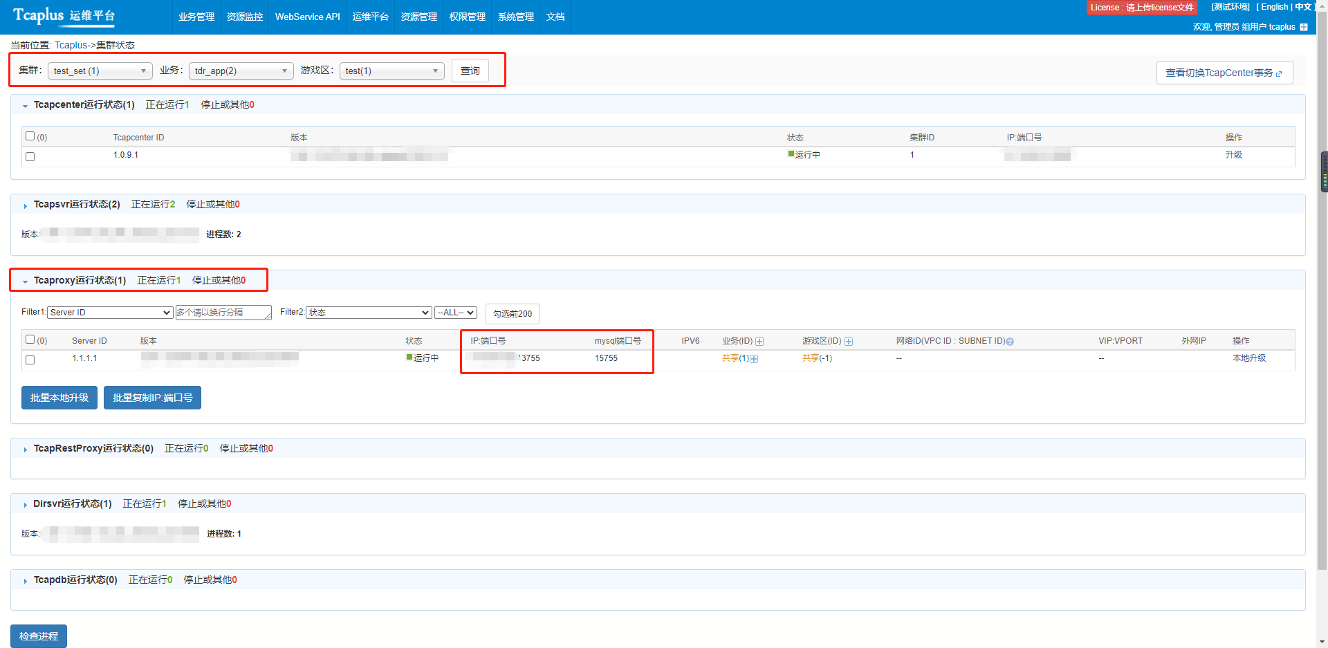 Log in to the TcaplusDB OMS console, enter the "Operation and Maintenance Platform" ->"Cluster Status" page, select the corresponding app and game zone at the top of the page, click the "Query" button, select the IP of any process as the access address in the Tcaproxy process list, and select the MySQL port number of the process as the access port.