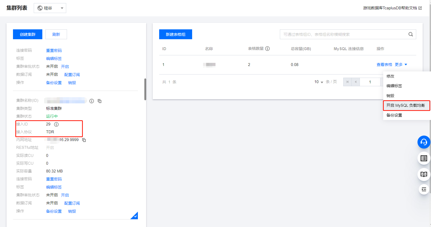 Log in to the Tcaplus DB Tencent Cloud Console page, select the corresponding cluster and table group, and enable MySQL load balancing. You can see the MySQL access information corresponding to the table group on the page.